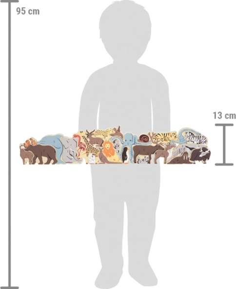 Otroška sestavljanka je sestavljena iz 26 kosov v obliki različnih živali, kot so alpaka, flamingo in pingvin, ki so barvno označeni s črkami angleške in nemške abecede. Vsak kos je enostavno prijemljiv in otroci jih lahko uporabljajo posamično ali sestavijo v celotno sestavljanko. Ta interaktivna sestavljanka je ne le zabavna, ampak tudi učna, saj pomaga otrokom prepoznavati črke in imena živali.
