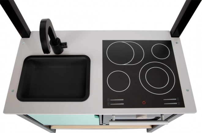 Za maksimalno igralno izkušnjo ne manjkajo vodovodna pipa z ročico za uravnavanje “temperature”, odstranljivo plastično korito za “pomivanje posode” in pečica z odstranljivim pekačem. Dno police je mogoče uporabiti kot rešetko za žar. Omara pod delovno površino in kljukice za pripomočke poskrbijo za red, pri čemer je levi del omarice mogoče igrivo spremeniti v “hladilnik” ali “pomivalni stroj”.