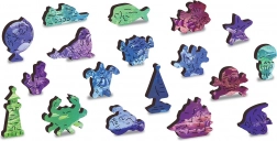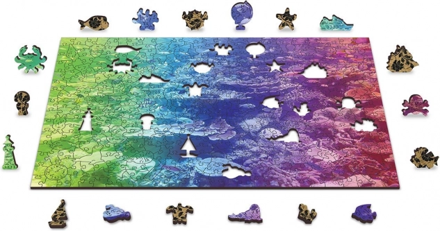 Lesene puzzle Koralni greben 2v1 prinašajo edinstveno izkušnjo sestavljanja – na eni strani sestavljate po barvnem motivu, na drugi pa po oblikah z ponavljajočim se vzorcem. Del koščkov ima izvirne oblike živali, predmetov ali zgradb, zaradi lasersko poudarjenih detajlov pa delujejo kot majhne samostojne figurice.