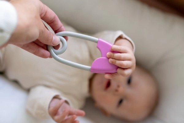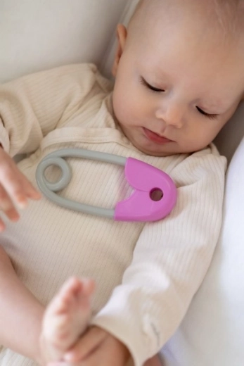 Ropotuljica v obliki zaponke je nepogrešljiv del opreme vsakega otroka. Zasnovana je tako, da jo lahko majhne rokice zlahka primejo, njena lahkost pa ne obremenjuje otroških rok. Njene rožnato-sive kontrastne barve pritegnejo pozornost in podpirajo vizualno zaznavanje. Otroci bodo vzljubili nežno ropotanje, ki spremlja vsak premik.