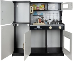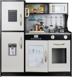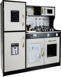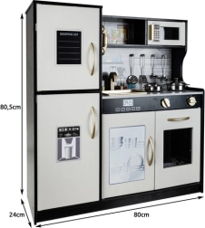 Elegantna lesena kuhinjica XL blagovne znamke KRUZZEL v kombinaciji črne, bele in zlate barve otrokom prinaša realistično igro kuhanja. Ponuja LED osvetlitev, zvočne učinke gorilnikov, premične elemente ter bogat priložen pribor (lonec, ponev, pokrovka, 4 žlice). Odstranljiv pomivalni korito, pečica, mikrovalovna pečica in shranjevalne omarice na “klik” spodbujajo kreativnost, učenje skozi igro in igranje vlog.