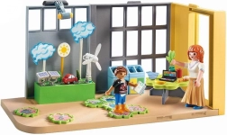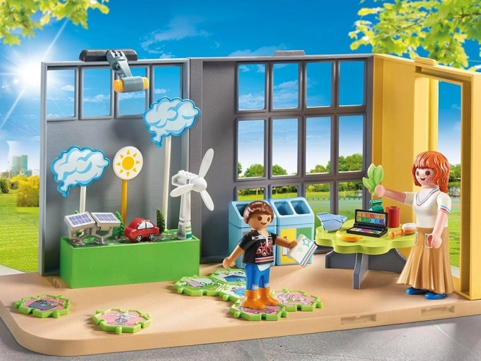 Vsebina vključuje koše za ločeno zbiranje odpadkov, rastline, ekološke dekoracije, elemente “zelene” infrastrukture in šolsko opremo. Set je združljiv z drugimi gradbenimi seti PLAYMOBIL (npr. razširitve šolskih učilnic), zato ga zlahka povežete v večji šolski svet.