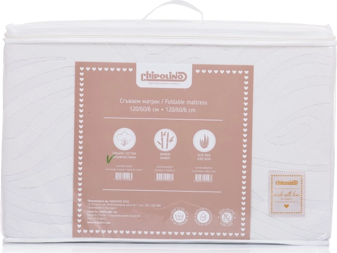 Zložljiva vzmetnica CHIPOLINO dimenzij 120 × 60 cm združuje naravno udobje in praktičnost. Prevleka iz BIO/organskega bombaža je nežna do kože, brez pesticidov in škodljivih kemikalij, zato je primerna tudi za občutljive otroke in alergike. Jedro iz visokokakovostne poliestrske pene zagotavlja uravnoteženo oporo hrbtenici z dolgo življenjsko dobo.