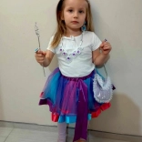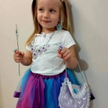 Čaroben 9-delni komplet v hipu spremeni vsakega otroka v pravo princeso. Pisano tutu krilce v tonih rožnate, vijoličaste in modre izstopa z nadihanim tilom in udobnim pasom. Elegantna tiare z rožnatimi kamni, bleščeč ogrlica in uhani poudarijo slovesen videz, medtem ko čarobna paličica in ljubka torbica zaokrožita celoten outfit.