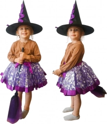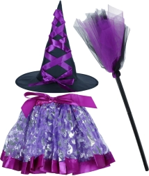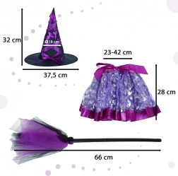 Odličen otroški čarovniški kostum ponuja celoten komplet s tremi dodatki: črno-vijoličnim klobukom, vijoličnim krilom in čarovniško metlo. Idealen za noč čarovnic in tematske zabave.