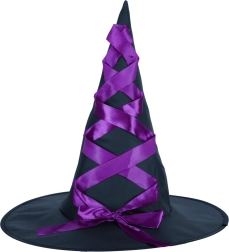 Črno-vijoličen klobuk z značilnim prekrižanim vijoličnim trakom doda kostumu avtentičnost.
