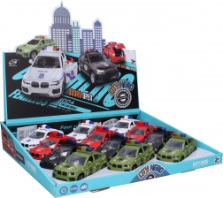 Na voljo so 4 oblikovne različice – gasilci, vojaško, policija SWAT in belo policijsko vozilo – idealne za zbirko ali kot darilo. Model ima kompaktne mere 13 × 6 × 6 cm in se zahvaljujoč vztrajniškemu pogonu po navijanju zlahka požene naprej.