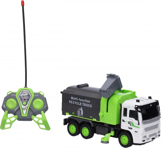 RC čistilni avto z daljinskim upravljanjem, svetlobnimi učinki in smetnjako. Kompaktne mere 20,5 × 10,5 × 13 cm. Baterije niso priložene.
