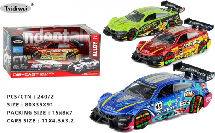 Kovinski dirkalni avto z dimenzijami 11x4,5x3,2 cm ponuja zabavo na avtomatsko vleko v treh barvnih različicah - zelena, rdeča in modra.