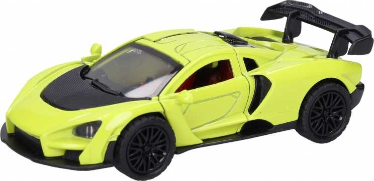 Kovinski avto Supersport 12 cm s povlečnim mehanizmom in odpirajočimi vrati v barvah zelena in oranžna.