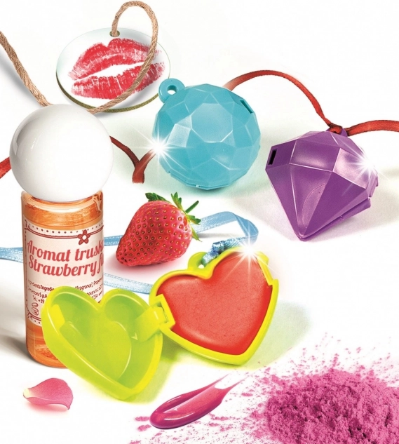 - Komplet vsebuje voščno mehčalno osnovo, prašnato barvilo in okusno jagodno aromo, s katerimi lahko ustvarite nežen in dišeč balzam za ustnice,