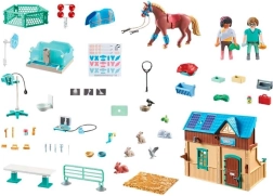 Dobrodošli na slikovitem ranču Waterfall, kjer se skupina prijateljev skrbno posveča svojim konjem ter pomaga ljudem in živalim. Ta podrobno zasnovan komplet PLAYMOBIL prinaša realistično okolje hipoterapije in veterinarske klinike z aquatrainerjem, ki ga je mogoče napolniti z vodo za nežno rehabilitacijo poškodovanih konj. Začetnica veterinarke Harleen skrbi za mucke in morske prašičke, medtem ko terapevt za konje Phil izvaja preglede in posege.
