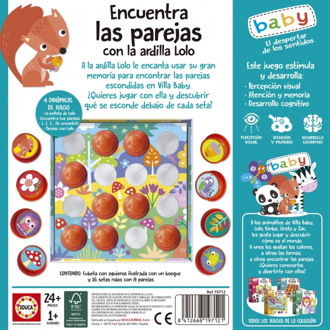 EDUCA Baby Poišči pare z veverico Lolo je izobraževalna igra, ki pomaga otrokom od 24 mesecev razvijati spomin, motoriko in ustvarjalnost z iskanjem ujemajočih se sličic.