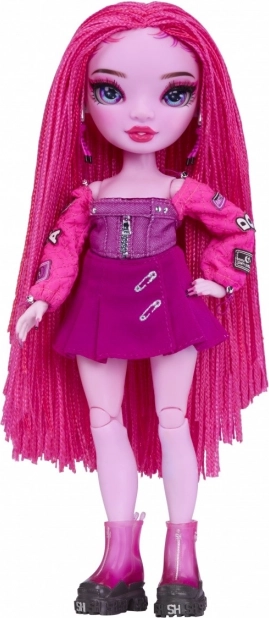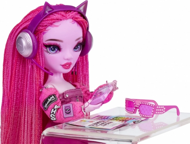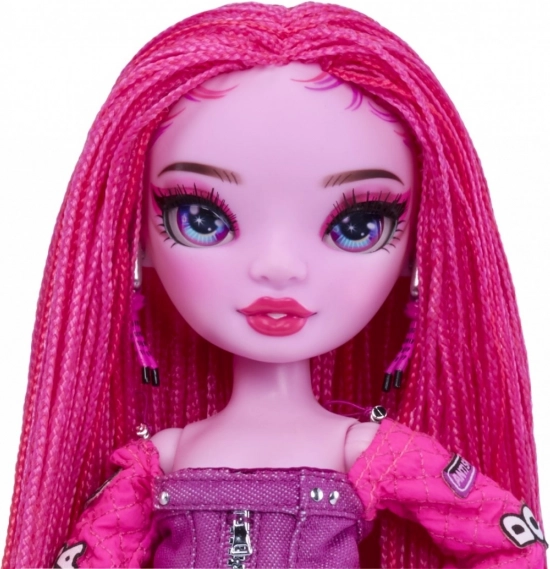 Lutka ima živo roza spletene lase, izrazite modre oči in podrobnosti obraza, ki poudarjajo njen stilski videz.