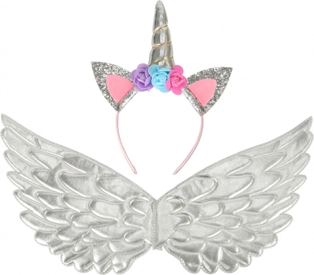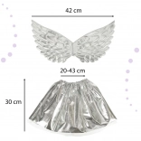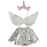 Ta čudovit kostum omogoča, da svojega otroka spremenite v edinstvenega samoroga. Sestavljen je iz srebrnega krila, elegantnih kril in natančno izdelanega naglavnega traku z rožicami. Idealen za vsako priložnost, ko si otrok lahko privošči pravljično igro.