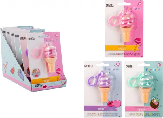 Prisrčno bleščilo za ustnice v obliki stožca s sladoledom, ki hkrati služi kot obesek. Na voljo v treh barvnih različicah in treh okusih, idealno za hitro osvežitev ustnic in stilni dodatek na torbo ali ključe.