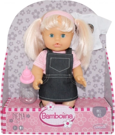 Punčka z blond kitkami je shranjena v privlačni rožnati škatli znamke Bambolina – pripravljena razveseliti kot darilo.