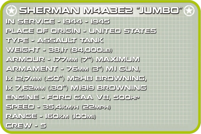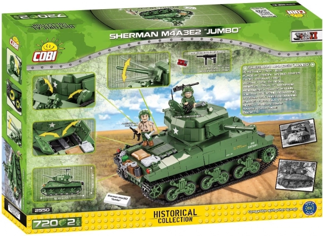 Ta dovršen model upodablja sloviti Sherman M4A3E2 »Jumbo« Cobra King – prvi tank, ki je prebil linije in prispel v obkoljeni Bastogne med Ardensko ofenzivo. Set COBI prinaša avtentičen videz z visokokakovostnimi potiski, ki se ne obrabijo niti pri intenzivni igri. Zahvaljujoč funkcionalnim elementom, kot so premične gosenice, vrtljiv stolp in odpirajoče se lopute, je model odličen tako za razstavo kot za dinamično igro.