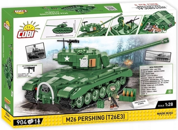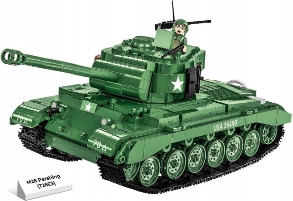 Odkrijte sodobne ameriške tanke Pershing, ki so sodelovali v zadnjih mesecih druge svetovne vojne in se izkazali s svojo učinkovitostjo. Ta model tanka je zvesto izdelan v merilu 1:28 z 904 gradniki COBI.