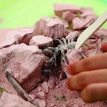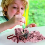 Mavčni blok skriva realistične figurice pajkov, črvov in mravelj. Otroci jih postopoma odkrivajo s priloženim dletom in čopičem.