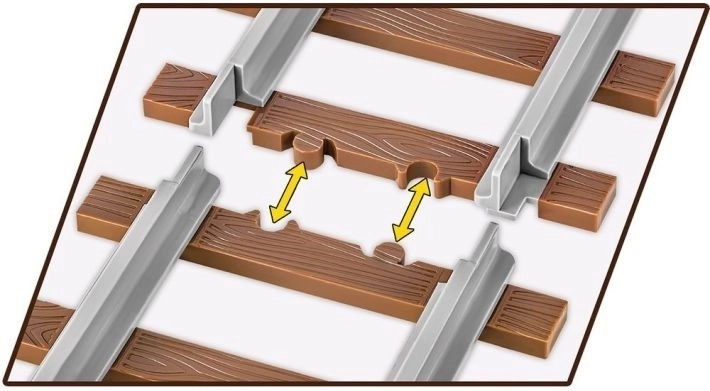 Del kompleta sta dve zamenljivi ploščici z imenom lokomotive, med katerima lahko izbirate: nemška BR 52 in poljska Ty2. Podjetje COBI je izdelalo tudi lasten oblikovni element kocke, ki reproducira odsek tira. V kompletu je na voljo pet takih odsekov s skupno dolžino približno 65 cm. Tiri so izdelani z moderno tehnologijo dvobarvnega brizganja, kar pomeni, da je vsak posamezni odsek dolžine približno 13 cm, ki je en sam element – monolit, izdelan iz dveh različnih barv plastike, ki sta med seboj trajno spojeni. Sive tirnice v barvi jekla jasno izstopajo iz zelo realistično izvedenih rjavih železniških pragov. Na vsakem železniškem pragu ni vidnih čepov (zatičev), kar povečuje njihovo realistično podobo, vsak pa je prekrit s strukturo desk, torej imitacijo lesene teksture. Tirnice je mogoče pripeti na gradbene plošče in imajo tehnično odprtino, zato jih je mogoče k železniškemu dioramu trdno pritrditi npr. s pomočjo vijaka ali žebljička.