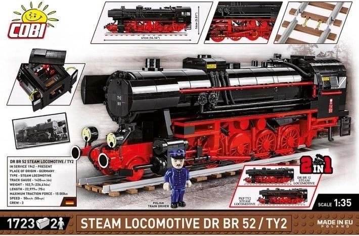 Komplet z blokovskim modelom nemške parne lokomotive DR BR 52 / TY2 iz druge svetovne vojne je del povsem nove kolekcije Vlaki v ponudbi podjetja COBI. Gradbeni set zvesto reproducira karoserijo, proporce in podrobnosti legendarne parne lokomotive, ki je verjetno najbolj priljubljena in najprepoznavnejša med vsemi železniškimi navdušenci na svetu. Posebna izdaja 2 v 1 vsebuje kar dva različna nabora dodatnih kock, ki omogočata sestavo modela nemške lokomotive DR BR 52 z nemško oznako iz obdobja druge svetovne vojne ali lokomotive s poljsko oznako Poljskih državnih železnic iz povojne Poljske ljudske republike. Poleg različnih kock z drugačnimi tiskanimi simboli, številčenjem in označevanjem komplet vsebuje tudi predelane, večje sprednje in zadnje luči za poljsko izvedbo, izbrane kocke v drugačni barvni različici ter dve različni figuri: nemškega strojevodjo iz obdobja druge svetovne vojne in poljskega strojevodjo v povojni uniformi PKP z značilnim državnim grbom – poljskim orlom z kraljevo krono, ki so jo odstranili komunisti.