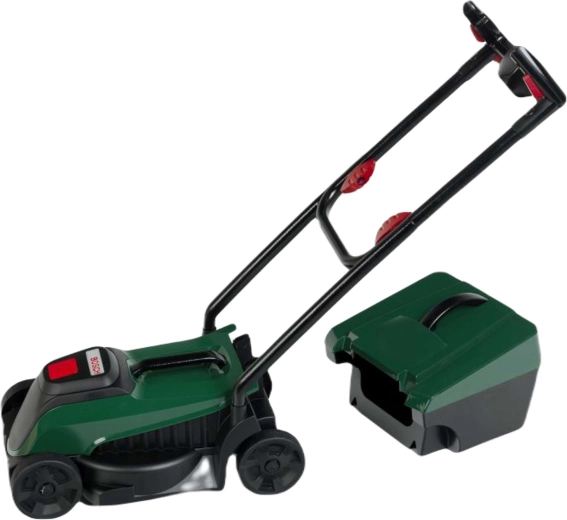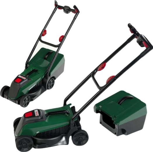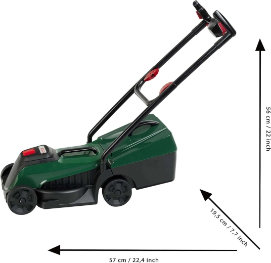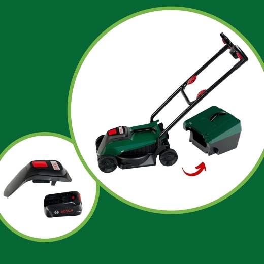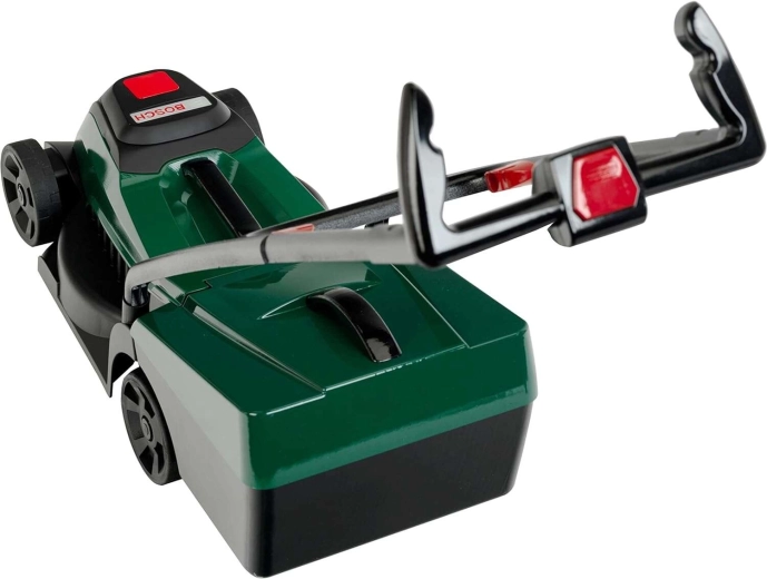 Ta otroška kosilnica zvesto posnema pravi stroj: ima temno zeleno ohišje, črn ročaj in premična kolesa, ki se gladko kotálijo po različnih površinah. Vgrajen, odstranljiv svetlobni in zvočni modul ob pritisku na gumb osvetli logotip BOSCH in predvaja realistične zvoke motorja. Tudi brez modula se pri potiskanju oglašajo prijetno mehansko »klikanje« in ritmično bobnenje koles.