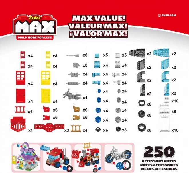 Uživajte v največ zabave in ustvarjalnosti s konstrukcijskim setom ZURU Max. Ta izjemen komplet vsebuje 250 delov, med katerimi so kolesa, vrata in okna. Gradite hiške in vozila, ki bodo imela dušo in edinstven slog. Ta set prinaša vrhunsko kakovost po dostopni ceni, ki razveseli vsako denarnico.
