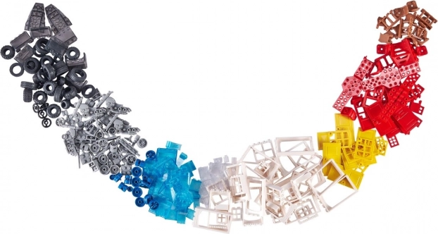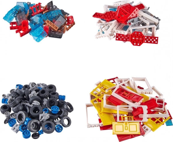 - Vsebuje 250 delov, primernih za gradnjo hiš in vozil: vrata, okna, dele streh, osi, karoserije in kolesa.