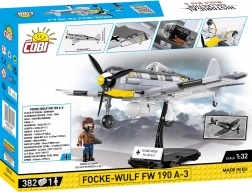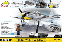 To enosedno bojno letalo je znano po močnem motorju BMW 801 D-2 in izjemnih lastnostih, ki vključujejo dodatni oboroževalni sistem. Sestavljanka Focke-Wulf FW 190 A-3 je verna replika letala v merilu 1:32, ki jo enostavno sestavite iz 382 kakovostnih gradbenih kock COBI. Letalonova državna barva je oživljena z natančno izdelanimi podrobnostmi.