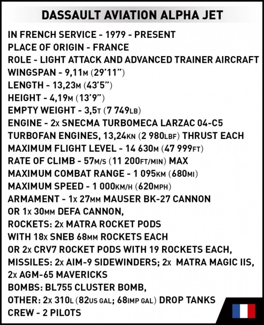 Alpha Jet je lahki napadalni in napredni trenažni letal, ki je rezultat nemško-francoske sodelovanja in je vstopil v službo v 70. letih 20. stoletja. Ta model iz kock je ustvarjen na podlagi licence francoskega proizvajalca vojaških letal Dassault Aviation in dopolnjuje kolekcijo modelov Oborožene sile v merilu 1:48.