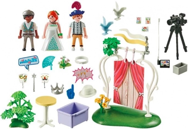 Pakiranje vključuje tri figurice PLAYMOBIL, platno za fotografiranje, fotoaparat na stojalu, visoko mizo, monitor in vrsto preoblačilnih dodatkov za spominske fotografije.