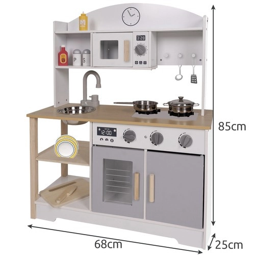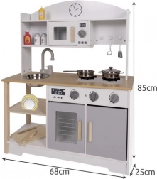 VRHUNSKA KAKOVOST - kuhinja je izdelana iz kakovostnega lesa, kar bistveno vpliva na njeno trajnost ter varnost in zdravje najmlajših. Gre za brezčasen dizajn, ki bo razveselil vsakega malčka. Zaradi klasičnega videza je bila vedno visoko cenjena. Izjemno skrbna izdelava skupaj z estetsko izvedbo in poudarkom na najmanjših detajlih daje izdelku dodatno vrednost in je prava paša za oči. Kuhinja lahko uspešno opravlja tudi dekorativno funkcijo in je okras otroške sobe.