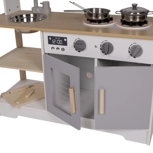 ANALOGNA URA + Zvoki - analogna ura je nameščena v višini otrokovih oči, kazalci so premični, zato se lahko otrok uči časa, gorilniki na kuhinji in v mikrovalovni pečici ob preklapljanju gumbov klikajo! Vaš otrok bo navdušen – kuhinja mu omogoča ure brezskrbne igre.