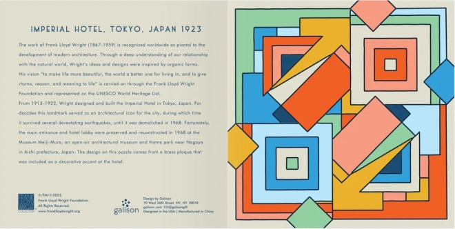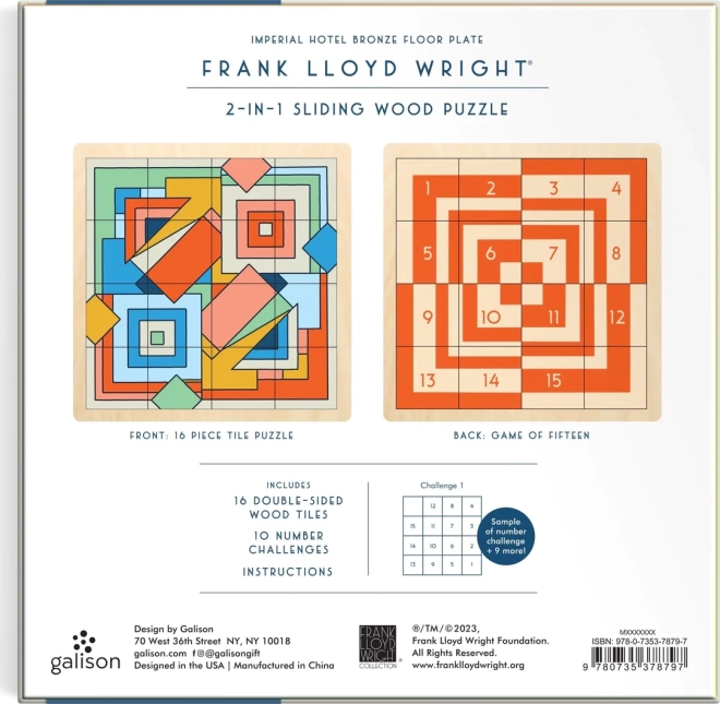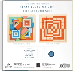Elegantna drsna lesena sestavljanka, navdihnjena z ikoničnim dizajnom FRANK LLOYD WRIGHT – Imperial Hotel, ponuja zabavo 2v1: klasično sestavljanje motiva in logično igro petnajst. Kakovostna lesena izvedba, kompaktne mere in zabavno premikanje koščkov jo naredijo odlično darilo in stilski dodatek za mizo.