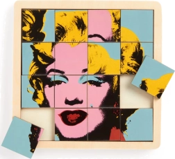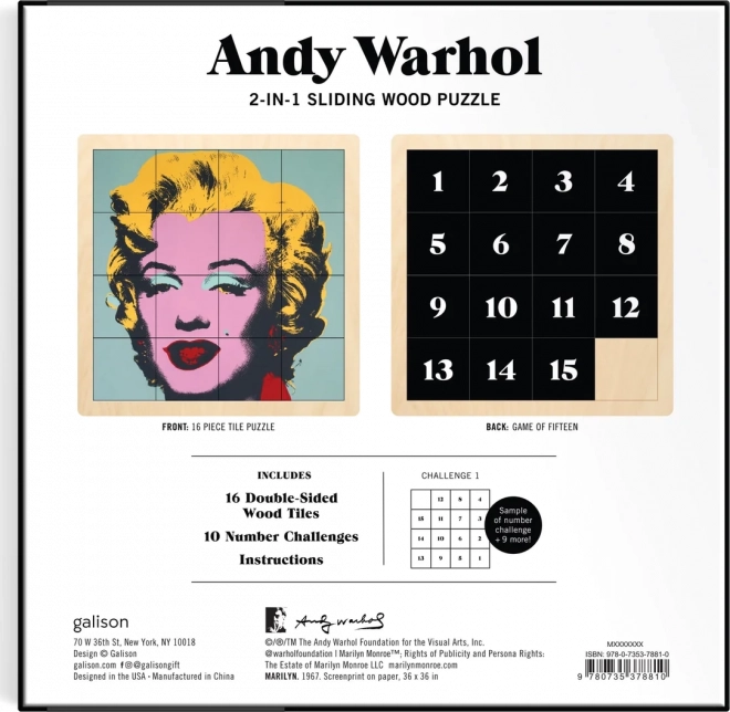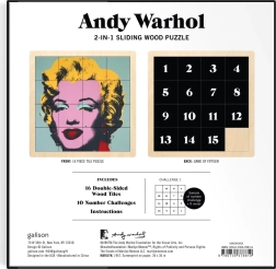 Te edinstvene drsne lesene puzzle ponujajo ure zabave in kreativnega izziva. Na eni strani boste našli ikonični motiv Andyja Warhola, na drugi pa številčni ugankarski izziv: Igra petnajst. Puzzle velikosti približno 15 x 15 cm so zasnovane tako, da zahtevajo zbranost in strategijo.