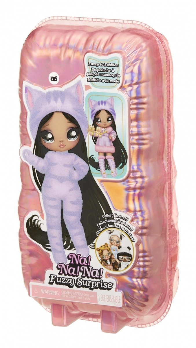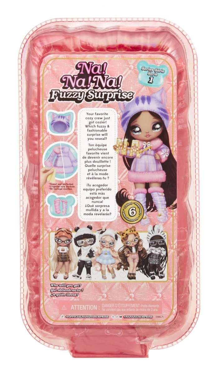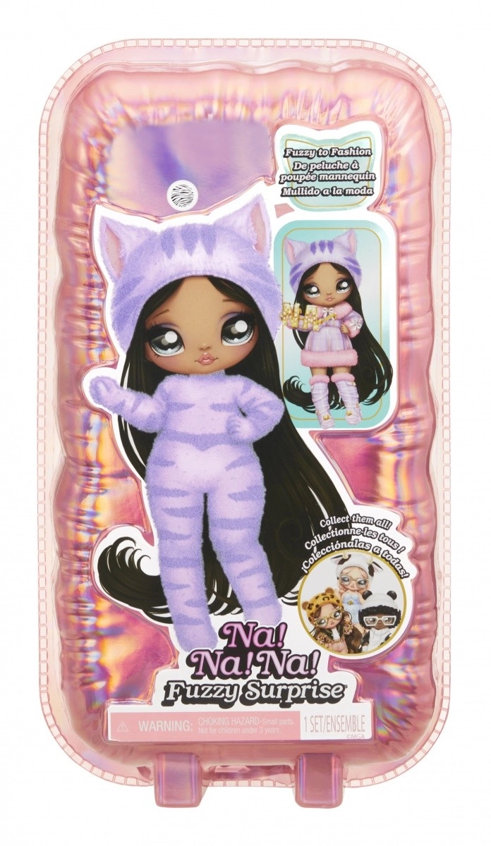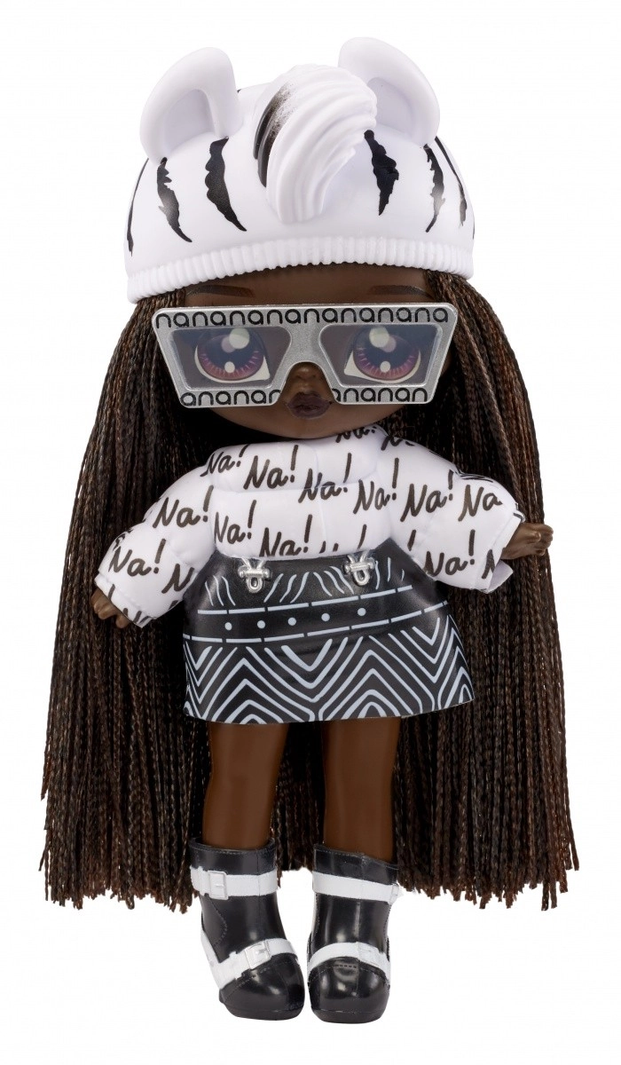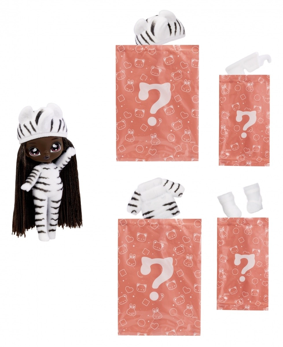 Doživite novo razkrivanje punčk s kolekcijo NA! NA! NA! Fuzzy Surprise. Vsaka 17 cm punčka ima nežno flokirano telo, ki ga le obrišete z vlažno krpico, da razkrijete njen edinstven videz, izrazne potise obraza in modne dodatke. Zebra Girl navduši z črno-belim živalskim slogom, snemljivo kapo z ušeski in izraznimi očali.