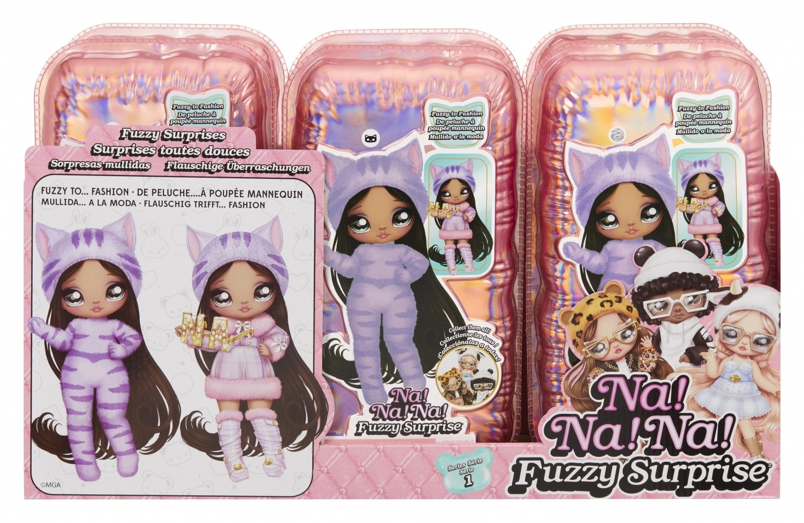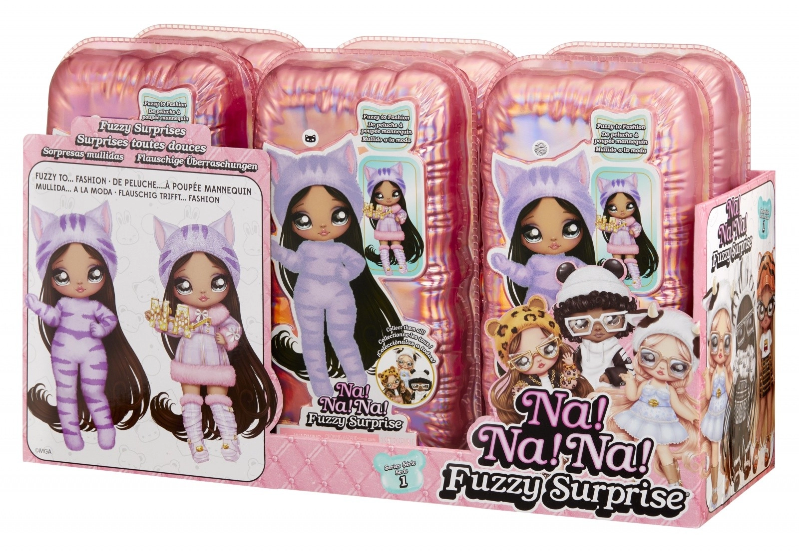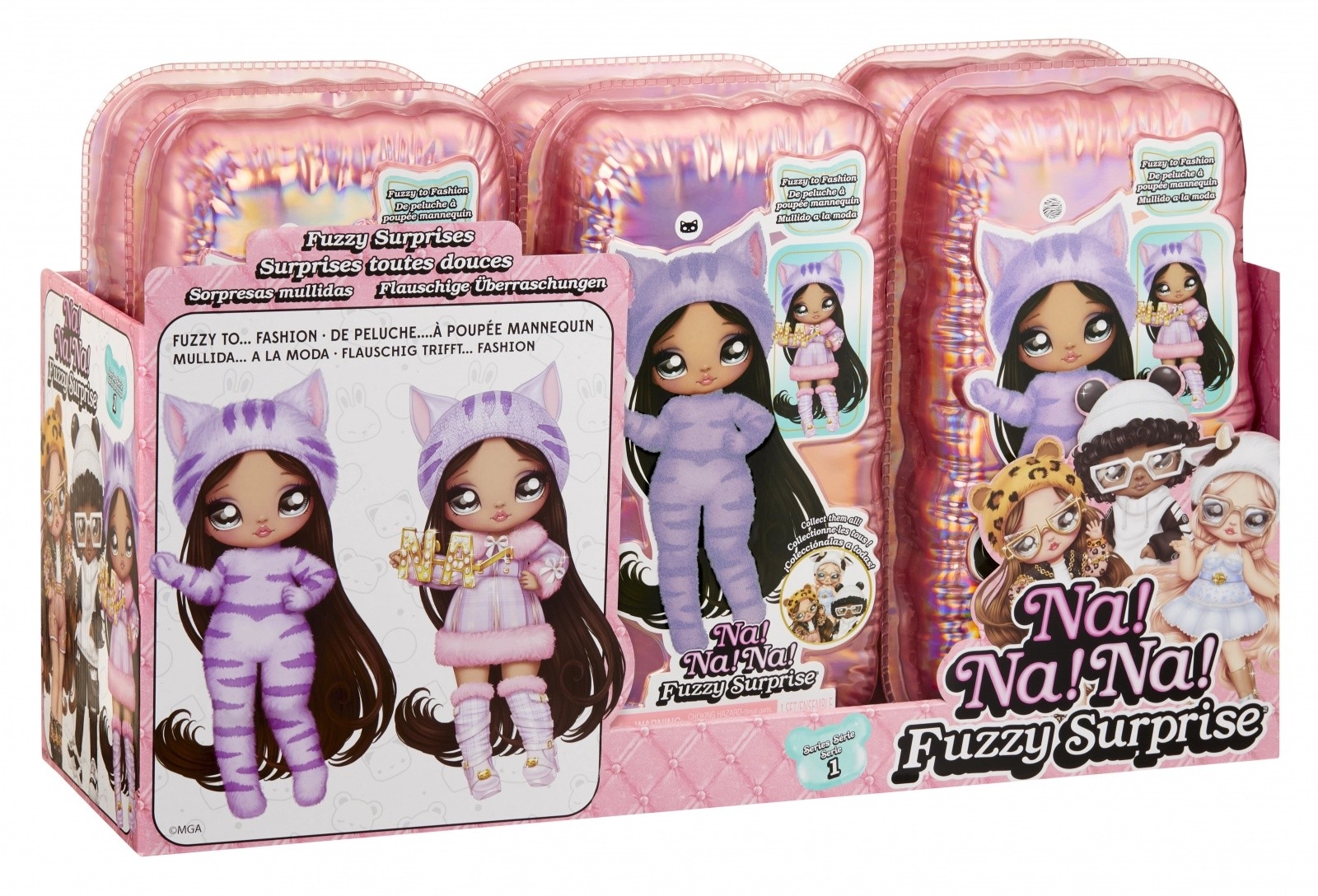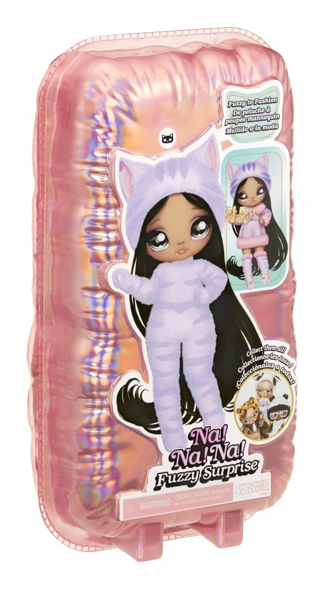 Doživite novo razkrivanje punčk s kolekcijo NA! NA! NA! Fuzzy Surprise. Vsaka 17 cm punčka ima nežno flokirano telo, ki ga le obrišete z vlažno krpico, da razkrijete njen edinstven videz, izrazne potise obraza in modne dodatke. Zebra Girl navduši z črno-belim živalskim slogom, snemljivo kapo z ušeski in izraznimi očali.