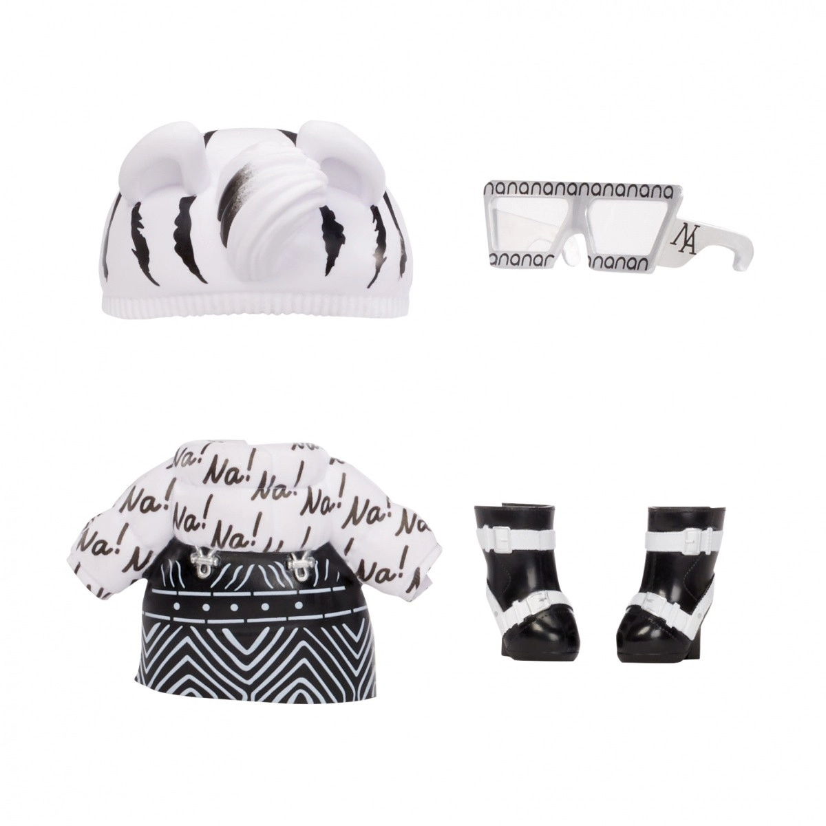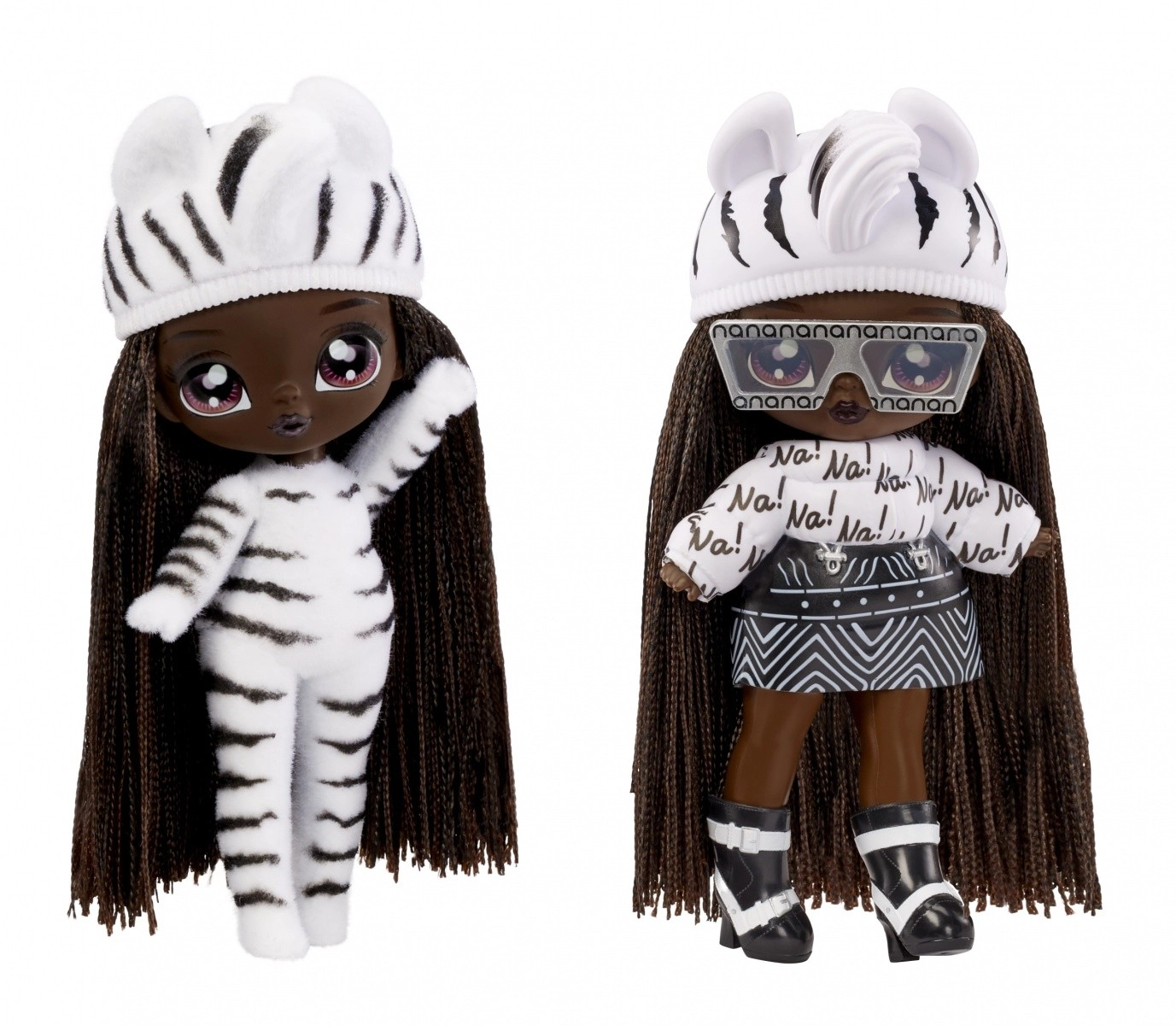 Zebra Girl prihaja v črno-belem živalskem videzu s krilom, topom »Na!«, kapo z ušeski, sončnimi očali in čevlji – idealno za modno igro.