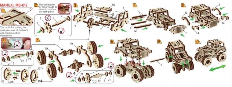 Model je izdelan iz kakovostne vezane plošče, sestavi se brez lepila in orodja ter je primeren tudi za začetnike. Za tekoče delovanje mehanike zadostuje, da rahlo namastite zobnike in osi z voskom (npr. iz sveče), s čimer zmanjšate trenje in podaljšate življenjsko dobo.