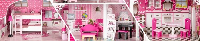 Hiška za punčke ECOTOYS je odličen prostor za vse male ljubiteljice domišljijske igre. Ponuja 3 neodvisna nadstropja in skupaj 7 sob, ki popolnoma posnemajo pravi stanovanjski dom. Vsaka soba je dokončana v drugačnem slogu, kar omogoča otrokom igranje notranjih oblikovalcev in postavitev pohištva po lastni domišljiji.