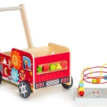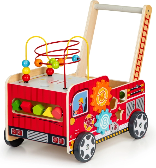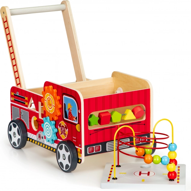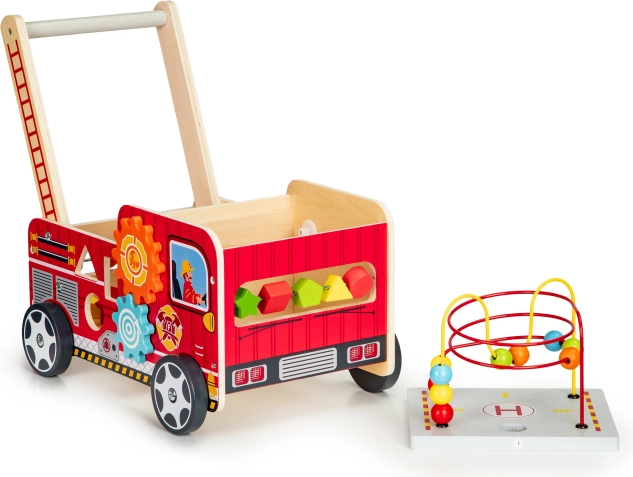 Lesena hojica v obliki gasilskega avta je idealen pomočnik za prve korake vašega otroka. Hojica je zasnovana tako, da zagotavlja stabilnost in hkrati zabavo s pomočjo različnih interaktivnih elementov kot so zobniki, labirinti z kroglicami in sortirnik oblik.
