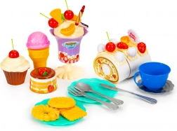 Poleg torte najdete v setu še druge barvite sladkosti, kot so korneti za sladoled, rogljički in košarice, ki dodajajo pristnost in bogatijo igro. Otroci lahko razvijajo svojo domišljijo in fino motoriko, ko aranžirajo in servirajo te dobrote.