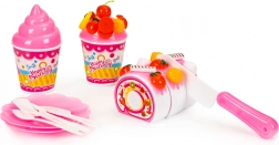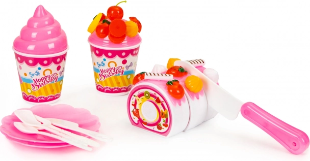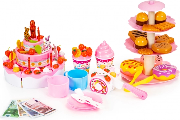 Poleg torte set vključuje različne sladke dodatke, ki igro naredijo še bolj privlačno. Vsebuje piškote, mafine, krofe in sladoled v kozarcih, idealno za zabavno igro.