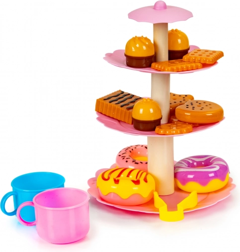 Set vsebuje elegantno trietažno stojalo za sladice, na katerega lahko otroci odlagajo vse sladkarije. Popoln dodatek za organizacijo namišljenih zabav in čajank.