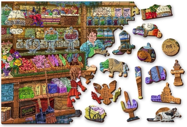 Odkrijte čar nostalgije motiva slaščičarne z lesenimi sestavljankami WOODEN CITY Sladka pustolovščina 2v1. Natančna laserska obdelava zagotavlja gladke robove brez trsk in prijeten občutek pri sestavljanju. Sestavljanka je dvostranska – na sprednji strani sestavljate barvno sliko, na zadnji ponavljajoči se vzorec, idealen za sestavljanje po oblikah.