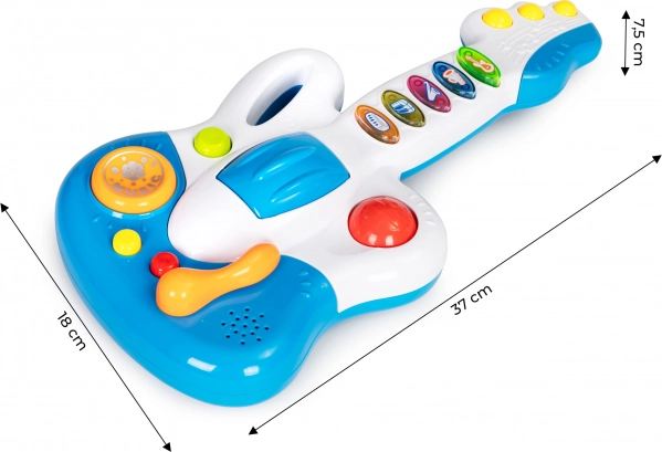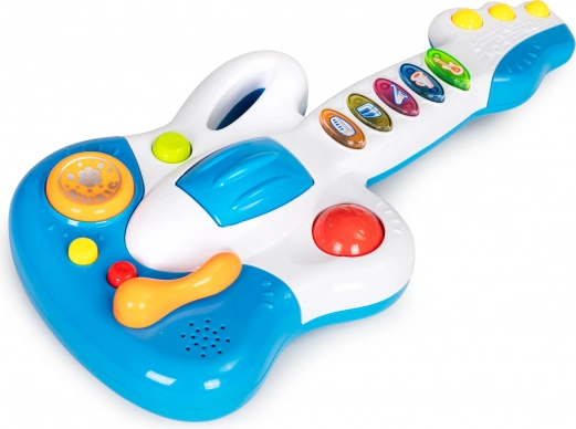 Kitara je opremljena s 5 barvnimi gumbi, vsak z drugačnim zvokom ali melodijo. Dodatna privlačna funkcija je vrteča se kroglica, ki deluje kot ropotuljica.