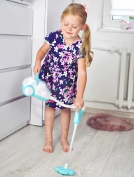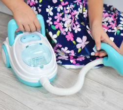 Ta modro-bel otroški sesalnik verno posnema pravi aparat – po vklopu sveti, oddaja realistične zvoke in zahvaljujoč funkciji sesanja posesa priložene polistirenske kroglice. Odličen je za igro vlog, spodbuja odgovornost in na igriv način uči otroke ohranjati red.
