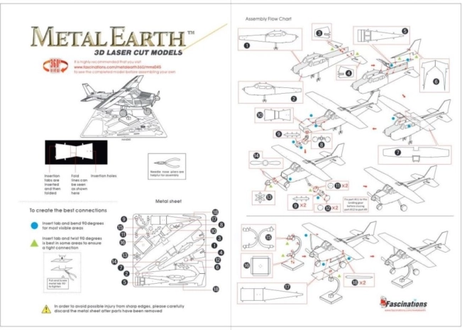 3D sestavljanka METAL EARTH predstavlja elegantno kombinacijo tehnične natančnosti in ustvarjalne zabave. Iz kovinskih ploščic velikosti 11 × 11 cm iztisnete posamezne dele in jih s pomočjo zatičev spojite v realističen model CESSNA 172 SKYHAWK. Lasersko graviranje poudari detajle in modelu doda avtentičen videz.