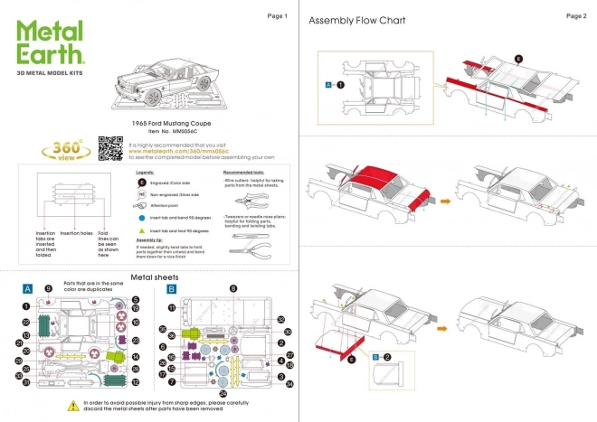 Vznemirljiv izziv, užitek pri sestavljanju in osupljiv rezultat – to so modeli METAL EARTH! Model zbirateljskega vozila Ford Mustang 1965 za vse ljubitelje starodobnikov. Sestavljanje 3D sestavljanke METAL EARTH zahteva potrpežljivost in spretne roke. Končni rezultat pa v celoti poplača vložen trud! Miniaturne replike so posebej impresiven in privlačen okras ne le doma, temveč tudi v pisarni ali šoli. Iz kvadratnih jeklenih ploščic (11 x 11 cm) bo pod vašimi rokami nastal podrobno izdelan, fascinanten model. Avtentičen videz 3D sestavljanke METAL EARTH je dosežen zahvaljujoč podrobnemu laserskemu graviranju. Paket vsebuje 2 jekleni ploščici in navodila za sestavljanje. Orodje ni vključeno. DELOVNI POSTOPEK: Posamezne dele odstranite iz kovinskih ploščic; po potrebi uporabite majhne klešče za rezanje (niso priložene). Delci se med seboj spajajo z zaskočnimi zapirali, ki jih tvorita jeziček in odprtina. Jeziček upognite z majhnimi, tankimi kleščami (niso priložene) in postopoma povežite vse zapore, dokler ne nastane zelo realističen mojstrski kos! Priporočena starost: od 14 let. Dimenzije sestavljene sestavljanke približno 8,5 × 4,2 × 4,5 cm